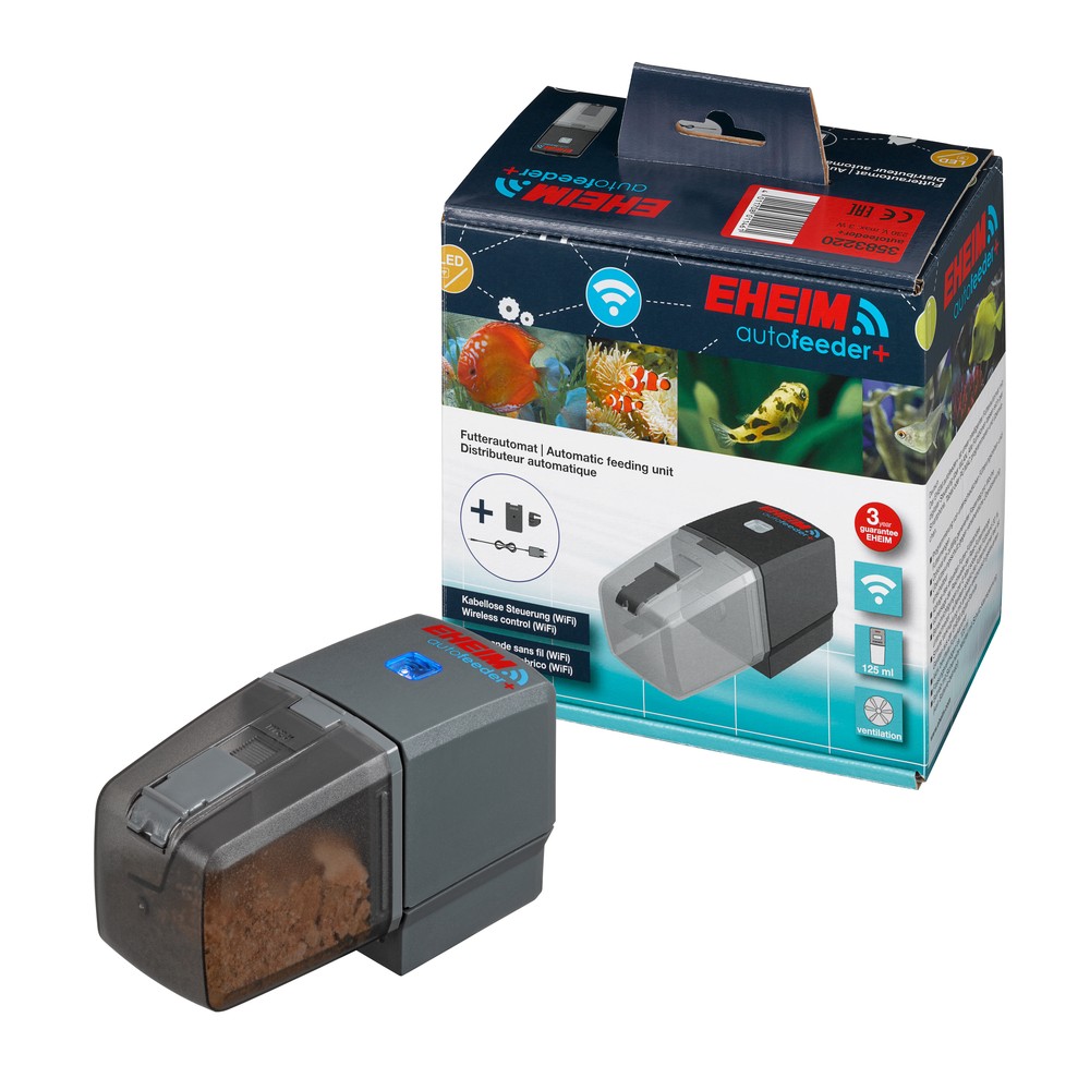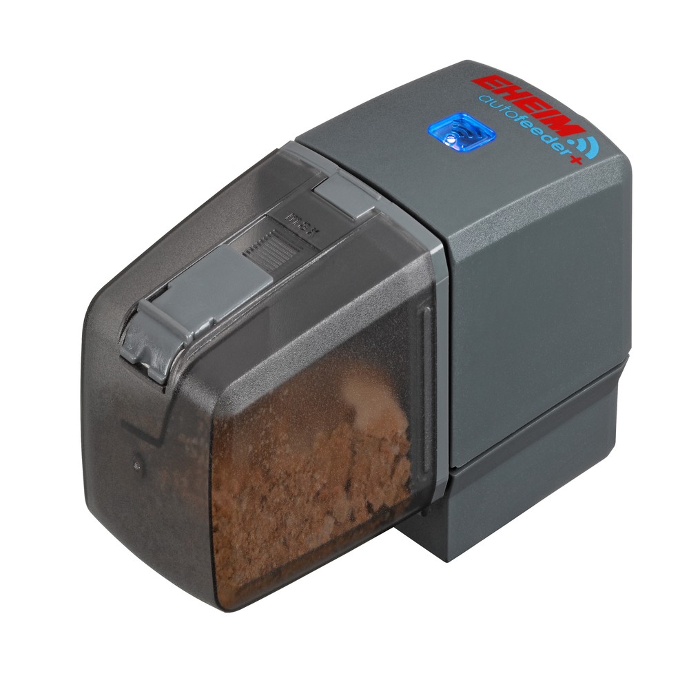 The EHEIM autofeeder+ is our intelligent automatic feeder with digital control via WLAN. functions can be programmed and monitored via smartphone, tablet or PC/MAC. You can set both feeding times and quantities individually and generate a fasting day. There is protection against overfeeding and you will alsoan email message when the food in the drum is running low. In addition, synchronisation with other devices in our WiFi programme is also possible. For example, when linked to the EHEIM thermocontrol+e aquarium heater, yowill be warned by email before feeding if the water temperature is too high and, when linked to the EHEIM professionel 5e external filter, the flow rate can be automatically reduced or increased for 10 minutes during feefeeding.