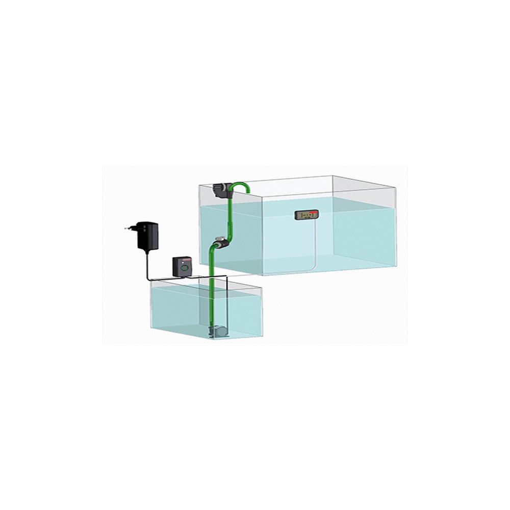 EHEIM waterrefievaporated water automatically. For this purpose a sensor is permanently measuring the water level. You simply place the EHEIM waterrefill outside on the glass pane of the aquarium – or in case of a marine water aquariumwater aquarium alternatively at the filter tank in the cabinet (sump). As soon as the water level sinks, the refill pump starts.