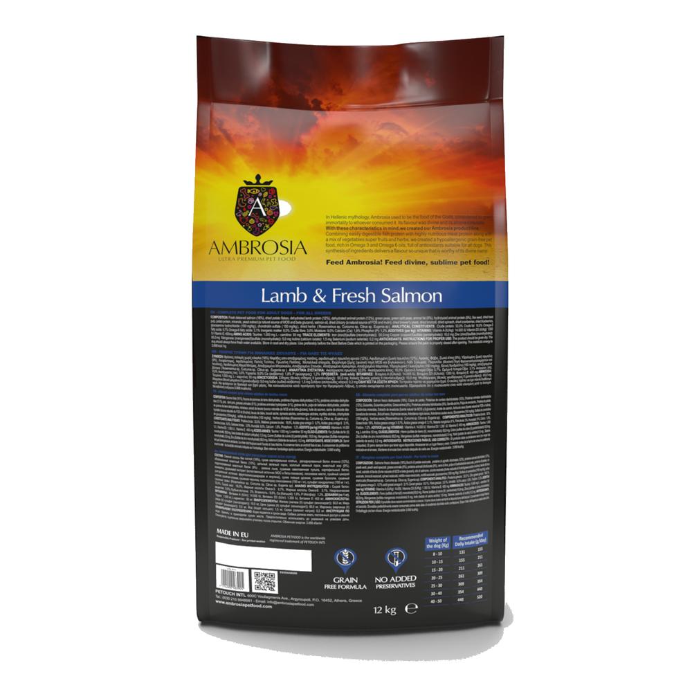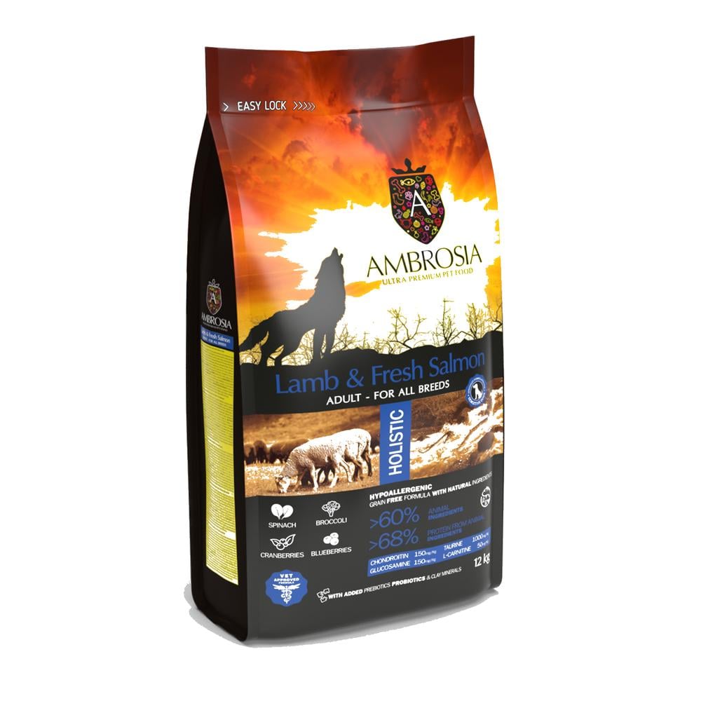 Allar Ambrosia vörurnar okkar eru lausar við erfðabreyttar lífverur og gervi litarefni. Þau eru líka laus við korn, maís og soja. Allar uppskriftir sameina tvo próteingjafa til að búa til einstakt bragð. Vatnsrofið prótein er einnig notað til að draga úr ofnæmisvöldum í fóðrinu. Að bæta við prebiotics og probiotics stuðlar að heilbrigði meltingar, en gott hlutfall af omega 3 og omega 6 hjálpar til við að viðhalda heilbrigðri húð og feld. Ambrosia Lamb & Fresh Salmon er frábært kornlaust fóður sem býður upp á alhliða næringu fyrir allar hundategundir.