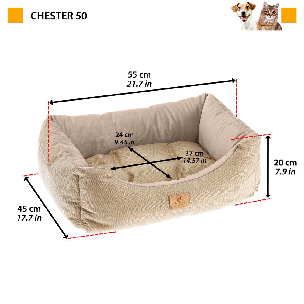 Chester is a cozy sofa for cats and dogs made of durable Tweed-effect fabric with refined velvet finishes. The bed, particularly suitable for the winter period, has a thick padding for maximum comfort and a lowered front side that allows easy access to your friend. The double-sided cushion, included, has one side in Tweed effect fabric and the other in soft velvet. All Chester indoor beddings are easy to maintain, comfortably machine washable at low temperatures (maximum 30° C). They are available in different colours and sizes. The smaller models are suitable for small dogs and cats.