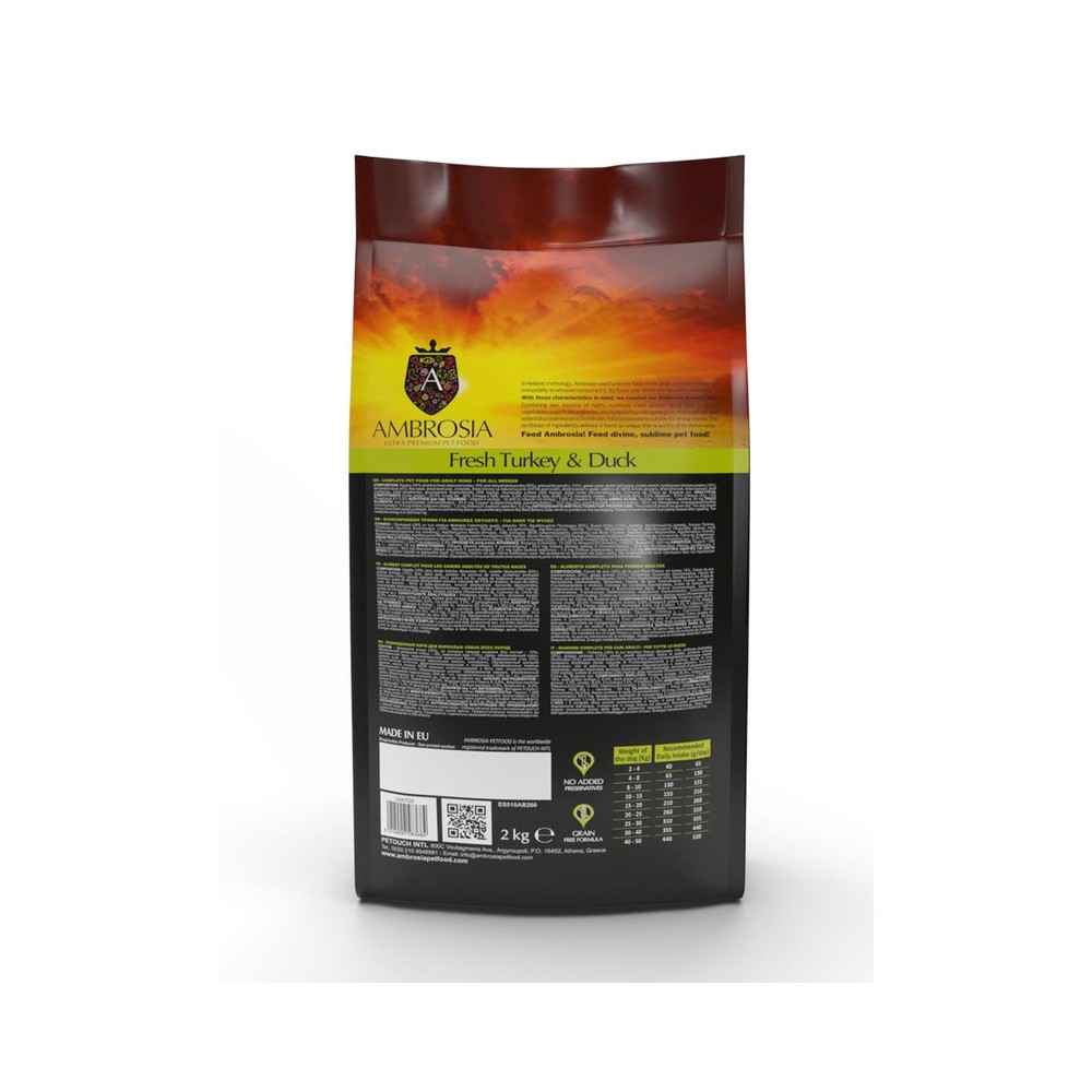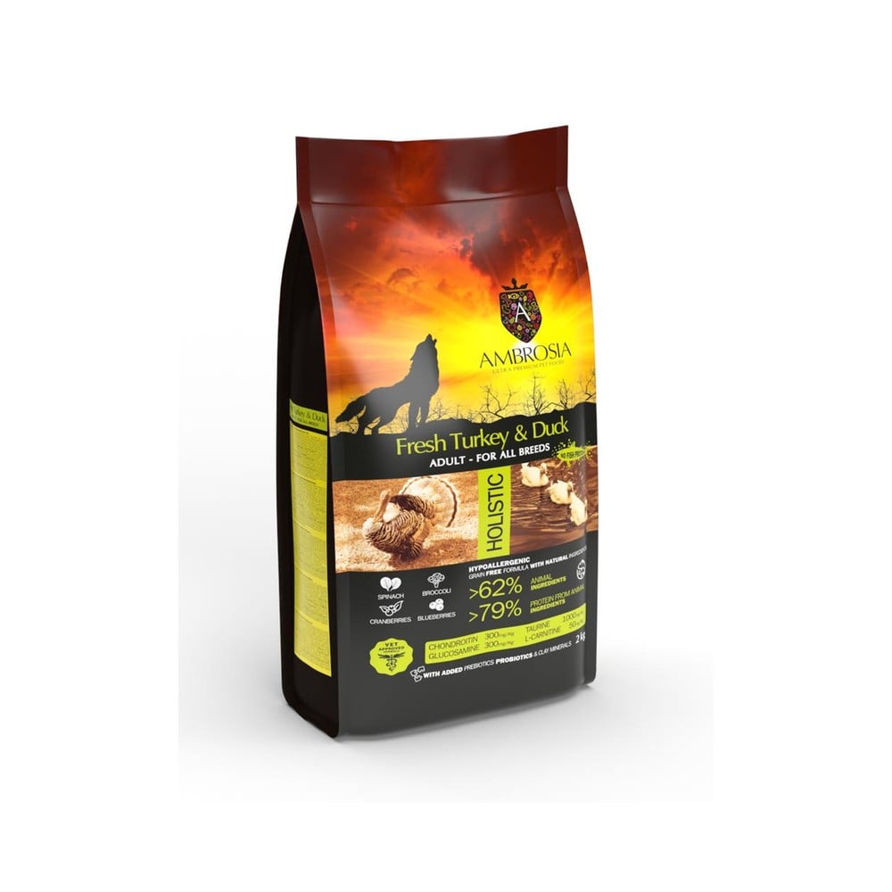 Ambrosia Fresh Turkey & Duck sameinar tvo alifugla próteingjafa sem koma úr ferskum kalkúnabringum ásamt þurrkaðri önd. Það inniheldur einnig prebiotics og probiotics til bæta meltinguna og ónæmiskerfið, chondroitin og glúkósamín til vernda liði og Taurine og L-Carnitine til styrkja hjartaog æðakerfi og vöðvakerfi. Kemur í meðalstórum bitum sem henta öllum hundategundum.
