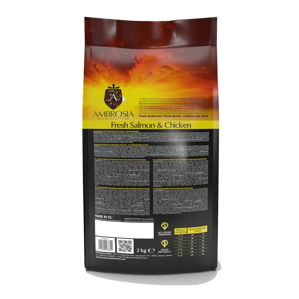 Litlir hundar hafa tilhneigingu til að vera orkumeiri en hundar af meðalstórum og stórum tegundum. Það er vegna hærra orkustigs og hraðari efnaskipta. Prótein– og fitumagn þarf að vera hátt til að veita næga orku og styðja vöxt vöðva. Amínósýrurnar Taurine og L-Carnitine gegna einnig mikilvægu hlutverki við að viðhalda vöðvamassa og heilbrigðum efnaskiptum. Glúkósamín og kondroitín eru einnig nauðsynleg til að styðja við liðamót smáhundategunda sem eru meira stressaðir vegna mikillar virkni í samanburði við stærri hundategundir. Til að koma til móts við viðkvæman maga þeirra höfum við notað fiskprótein í öllum Mini Breed uppskriftunum okkar, þar sem fiskur er auðveldasta próteinið í meltingu. Auk þess er innihaldið af Pure Care meltingarformúlunni okkar sem samanstendur af prebiotics, probiotics og Clay Minerals sem hjálpa meltingu og koma í veg fyrir meltingartruflanir. Ambrosia Fresh Salmon & Chicken er frábær kornlaust fóður sem býður upp á alhliða næringu fyrir allar hundategundir.