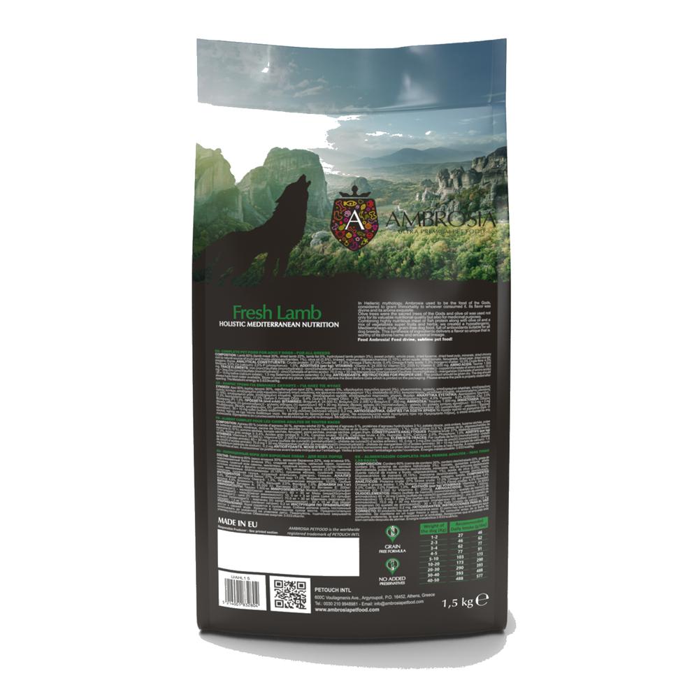 Lambakjöt 60% (lambakjöt 30%, þurrkað lambakjöt 22%, lambafita 5%, vatnsrofið lambaprótín 3%), sætar kartöflur, heilar baunir, þurrkaður refasmári, þurrkað kaffifífilsrót (náttúruleg uppspretta inúlín og frúktófásykra; 1%), ólífuolía (0,5%), hörfræ, mannan oligosaccharides (0,15%), þurrkuð epli, þurrkaðir tómatar, grikkjasmári, þurrkaðar perur, þurrkaðar appelsínur, oreganó, timjan.