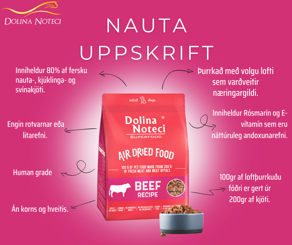 Kjöt og dýraafurðir úr nautakjöti veita dýrmætt prótein ríkt af amínósýrum og eru uppspretta nauðsynlegra efna fyrir heilsu – selen, járn og kopar. Nautakjöt er einnig uppspretta B12 vítamíns, sem er mikilvægt fyrir líkama hundsins, og fituleysanlegra vítamína. Viðbót af kjúklingaeggjum og kjúklingafitu auðgar þurrfóður Dolina Noteci SUPERFOOD línunnar með nauðsynlegum ómettuðum fitusýrum úr n-6 fjölskyldunni. Lífvirk efni sem finnast í gulrótum, spínati, bláberjum, hindberjum, appelsínum og baunum eru þekkt fyrir andoxunar- og bólgueyðandi eiginleika. Þau hafa veruleg áhrif á hömlun breytinga tengdum öldrun, þróun æðakölkunar og lifrarskemmda. Starfsemi meltingarvegarins, bæði meltingar og seytingar, er studd með því að bæta fóðrið með chia fræjum, hörfræjum, Mojave yucca og þara. Viðbót af gerjuðu geri og inúlíni úr sikoríurót bætir ástand feldsins og viðheldur réttri samsetningu þarmaflóru. Dýrmæt viðbót í þurrfóðri Dolina Noteci SUPERFOOD línunnar eru innihaldsefni úr Nýja Sjálands kræklingi, sem eru ábyrg fyrir að viðhalda réttu ástandi liðbrjósks og hafa bólgueyðandi áhrif á beinvef. Að fylgja ráðlögðu magni af fóðri sem gefið er hundinum veldur ekki hættu á ofþyngd eða offitu. Gott viðbót við mataræði sem byggir á þurrfóðri er að gefa hundinum ferskt drykkjarvatn, sem styður náttúrulega við upptöku innihaldsefna sem það inniheldur.