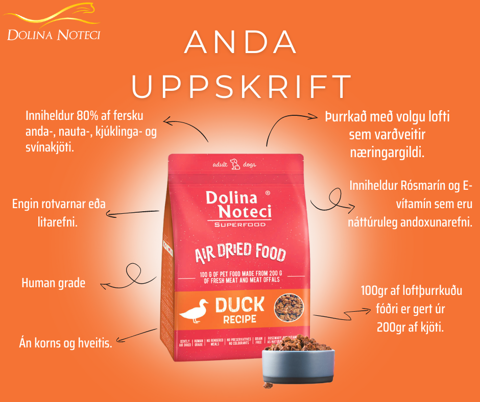 Andar kjöt og dýraafurðir veita dýrmætt prótein ríkt af amínósýrum og eru uppspretta nauðsynlegra efna fyrir heilsu – magnesíum, selen, járn og kopar – steinefni sem gegna mikilvægu hlutverki í að stjórna starfsemi húðar og vöðvavefs. Andar kjöt er einnig uppspretta B12 vítamíns og fituleysanlegra vítamína, sem er mikilvægt fyrir heilsu hundsins. Viðbótin af kjúklingaeggjum og kjúklingafitu auðgar þurrfóðrið Dolina Noteci SUPERFOOD með nauðsynlegum fitusýrum úr n-6 fjölskyldunni. Líffræðilega virk efni sem finnast í sætkartöflum, gulrótum, banana, epli, spínati, bláberjum, hindberjum, appelsínum, baunum og goji berjum eru þekkt fyrir andoxunar- og bólgueyðandi eiginleika. Þau hafa veruleg áhrif á að hindra breytingar tengdar öldrun, þróun æðakölkunar og lifrarskemmdir. Starfsemi meltingarvegarins, bæði meltingar og seytingar, er studd með notkun viðbóta: hörfræ, Mojave yucca og þara. Viðbótin af gerjuðu geri og inúlíni úr sikoríurót örvar rétta ástand feldsins og viðheldur réttri samsetningu þarmaflórunnar. Þurrfóður Dolina Noteci SUPERFOOD er bætt með grænbrúnni kræklingi frá Nýja-Sjálandi, sem er ábyrgur fyrir að viðhalda réttu ástandi liðbrjósks og hefur bólgueyðandi áhrif á beinvef. Viðbótin af lesitín í fóðrinu hefur verndandi áhrif á hverja lifandi frumu í líkama hundsins, og rósmarín hefur andoxunareiginleika. Fylgni við ráðlagðan skammt af fóðri sem gefið er hundinum veldur ekki hættu á ofþyngd eða offitu. Gott viðbót við mataræði sem byggir á þurrfóðri er að gefa hundinum ferskt drykkjarvatn, sem styður náttúrulega við upptöku innihaldsefna sem það inniheldur.