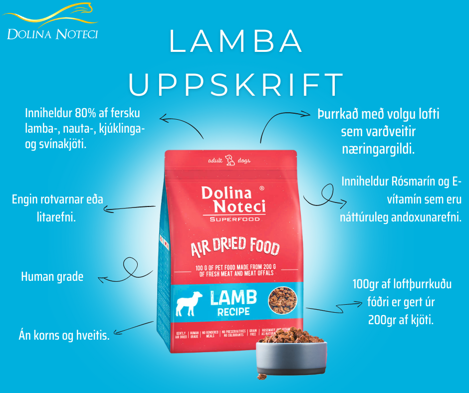 Lambakjöt er uppspretta sinks – steinefnis sem gegnir mikilvægu hlutverki í að stjórna húðstarfsemi. Það er einnig uppspretta B12 vítamíns og níasíns, sem eru mikilvæg fyrir líkama hundsins, sem eru mjög áhrifarík við að lækka kólesteról í blóði og hafa jákvæð áhrif á taugakerfið. Viðbót af kjúklingaeggjum og avókadó auðgar þurrfóðrið Dolina Noteci SUPERFOOD með nauðsynlegum ómettuðum fitusýrum úr n-6 fjölskyldunni, sem hafa andoxunar- og bólgueyðandi eiginleika, auk þess að hindra breytingar tengdar öldrun og koma í veg fyrir æðakölkun. Starfsemi meltingarvegarins, bæði meltingar og seytingar, er studd með notkun viðbóta eins og chia fræja, hörfræja, Mojave yucca og sjávarþörunga. Ávextir og grænmeti sem innihalda fóðrið eins og: sætar kartöflur, gulrætur, avókadó, spínat, bláber, hindber, trönuber, appelsínur, baunir, aspas og þurrkað ger og sikóríuinúlín eru uppspretta prebiotika sem hafa áhrif á rétta ástand feldsins og viðhalda réttri samsetningu þarmaflóru. Verðmæt viðbót í þurrfóðrinu Dolina Noteci SUPERFOOD er einnig grænlúppu kræklingur frá Nýja-Sjálandi, sem er ábyrgur fyrir að viðhalda réttu ástandi liðbrjósks og hefur bólgueyðandi áhrif á beinvef. Fylgni við ráðlagðan skammt af fóðri sem gefið er hundinum veldur ekki hættu á ofþyngd eða offitu. Gott viðbót við mataræði sem byggir á þurrfóðri er að gefa hundinum ferskt drykkjarvatn, sem styður náttúrulega við upptöku innihaldsefna sem það inniheldur.