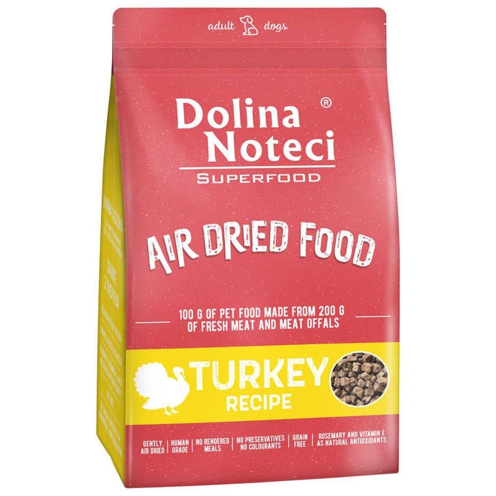 Dolina Noteci SUPERFOOD kalkúnaréttur er fullkomið þurrfóður sem uppfyllir 100% af daglegri næringarþörf fyrir fullorðna hunda af öllum tegundum. Fjölbreytt og verðmæt samsetningin inniheldur 80% ferskt kjöt og dýraafurðir úr kalkún, nautakjöti, kjúklingi og svínakjöti, sem eru uppspretta próteina með mjög háa meltanleika, rík af öllum nauðsynlegum amínósýrum. Nýstárleg framleiðsluaðferð sem felst í mildri þurrkun á kjöti og dýraafurðum og viðeigandi vali á hráefnum gerir fóðrið auðmeltanlegt og aðlagað næringarþörfum fullorðinna hunda. Þurrkunarferlið með heitu lofti gerir kleift að framleiða 100 g af fóðri úr allt að 200 g af kjöti og innmat, á meðan bragðgæði og nauðsynleg næringarefni haldast. Val á hráefnum ríkum af ýmsum vefjum: vöðva, bandvef og hjarta, tryggir bæði fjölbreytni næringarefna og áferðar, sem örvar meltingarferli á áhrifaríkan hátt. Dolina Noteci SUPERFOOD kalkúnaréttur inniheldur ávexti og grænmeti eins og: gulrætur, spínat, bláber, hindber, trönuber, tómata, appelsínur, baunir, goji ber, sem eru verðmæt viðbót við daglegt mataræði með snefilefnum og hafa veruleg áhrif á meltingarveg fullorðins hunds. Fóðrið inniheldur einnig: hörfræ, Mojave yucca og þara, sem styðja við rétta starfsemi meltingarkerfisins, auk rósmaríns, sem hefur andoxunareiginleika. Þurrkað ger og inúlín úr sikorí eru uppspretta prebiotika, sem styðja viðhald réttrar þarmaflóru. Bæði samsetning þurrfóðursins og áferð þess tryggja hátt bragðgæði. Fylgni við ráðlagða magn fóðurs sem gefið er hundinum veldur ekki hættu á ofþyngd eða offitu. Góð viðbót við mataræði sem byggir á þurrfóðri er að gefa hundinum ferskt drykkjarvatn, sem styður náttúrulega við upptöku innihaldsefna sem það inniheldur.