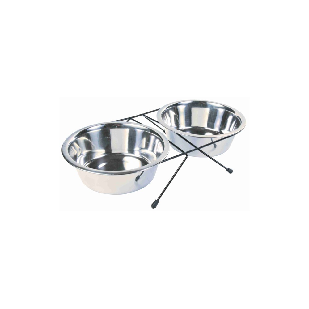 Tvær skálar á standi úr ryðfríu stáli með non-slip endum á fótunum. Skálrnar mega fara í uppþvottavél.