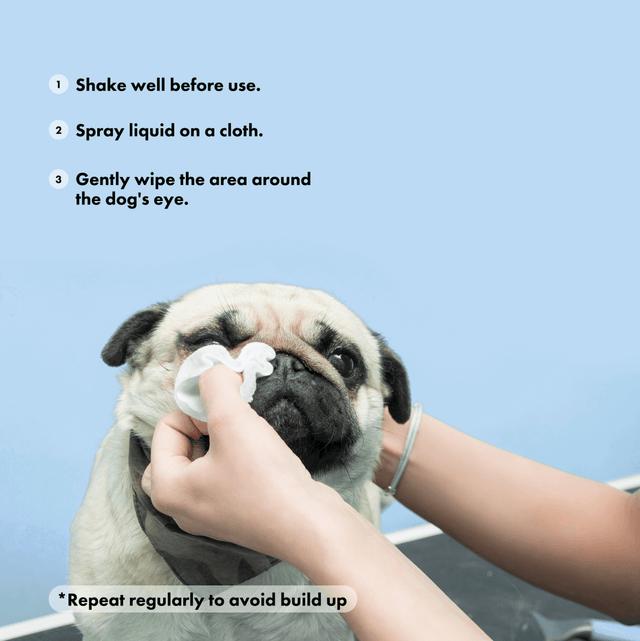 Hristið vel fyrir notkun. Bleytið bómullarpúða með vörunni og þurrkið svæðið hjá augum hundsins varlega. Ef það er nauðsynlegt, bleytið þá pappírsþurrku með volgu vatni og þurrkið.