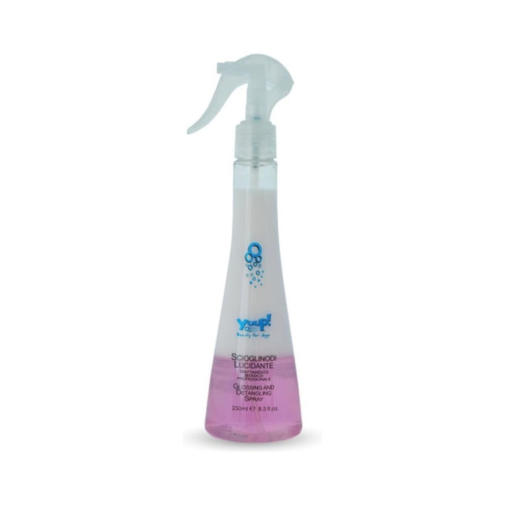 Flækju- og glanssprey frá Yuup fyrir allar feldgerðir. Getur stytt þurrktímann ef notað er í blautan feld. 250ml. Þarf ekki að blanda – tilbúið til notkunar. Inniheldur C- og E-vítamín fyrir feldinn. Mild lykt fyrir hundinn en góð fyrir eigandann. Hentar fyrir hunda og ketti. Feldvörurnar frá Yuup eru án parabena, þalata, sls og sles. Hristið brúsann fyrir notkun til að blanda efnunum saman og spreyið í þurran feld til að fá fram glans en blautan feld (án þess að skola úr) til að auðvelda flækjugreiðslu.