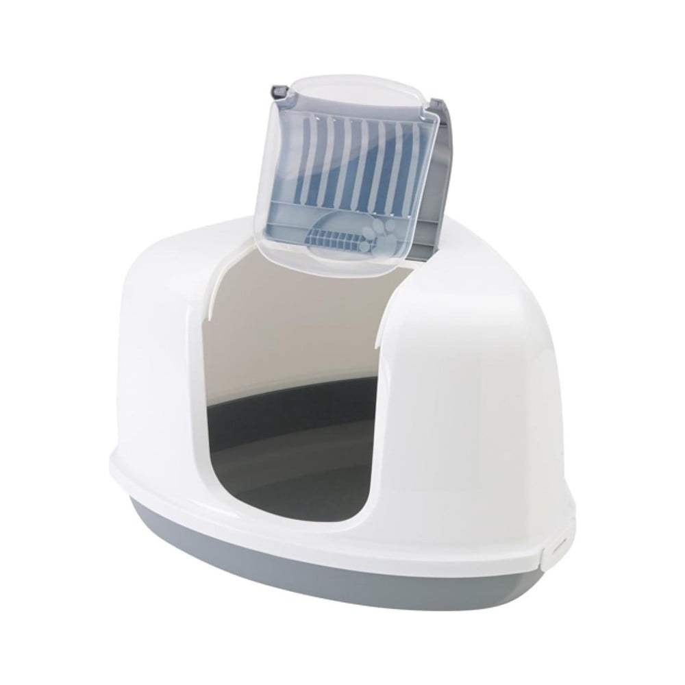 Lokað Kattaklósett með lúgu og handfangi í horn grátt/hvítt. Stærð: 58,5 x 45,5 x 40cm
