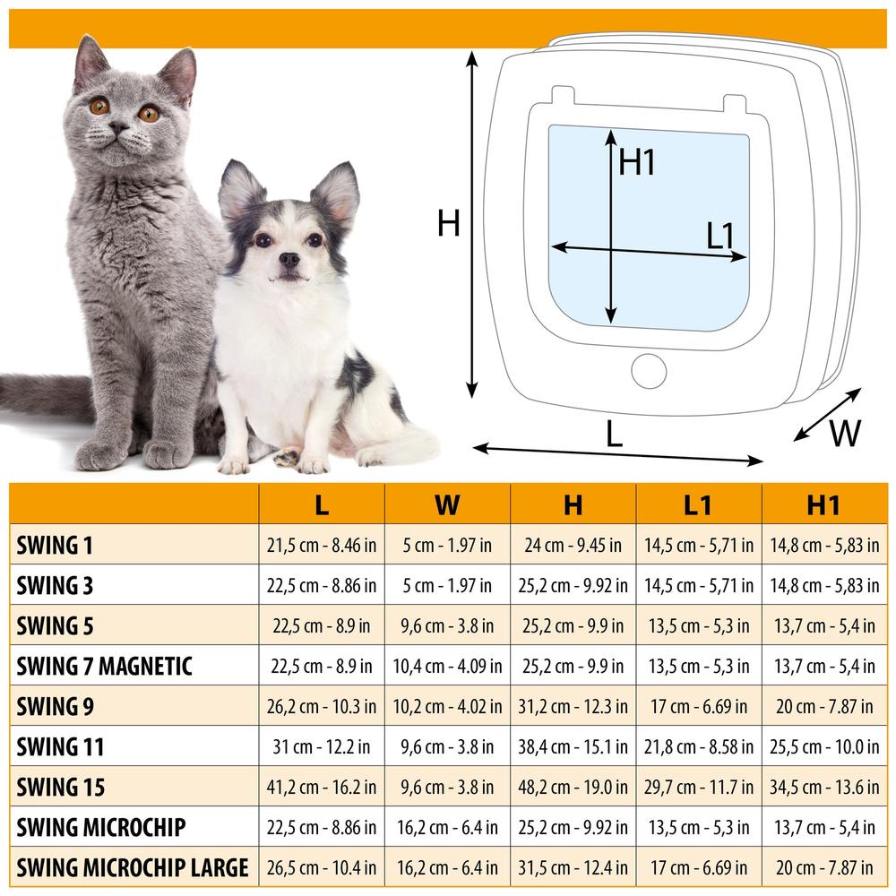 Swing 5 is a flap made of sturdy plastic for cats and small dogs. It can be installed on different structures and materials: wood, glass and metal, or brick walls.