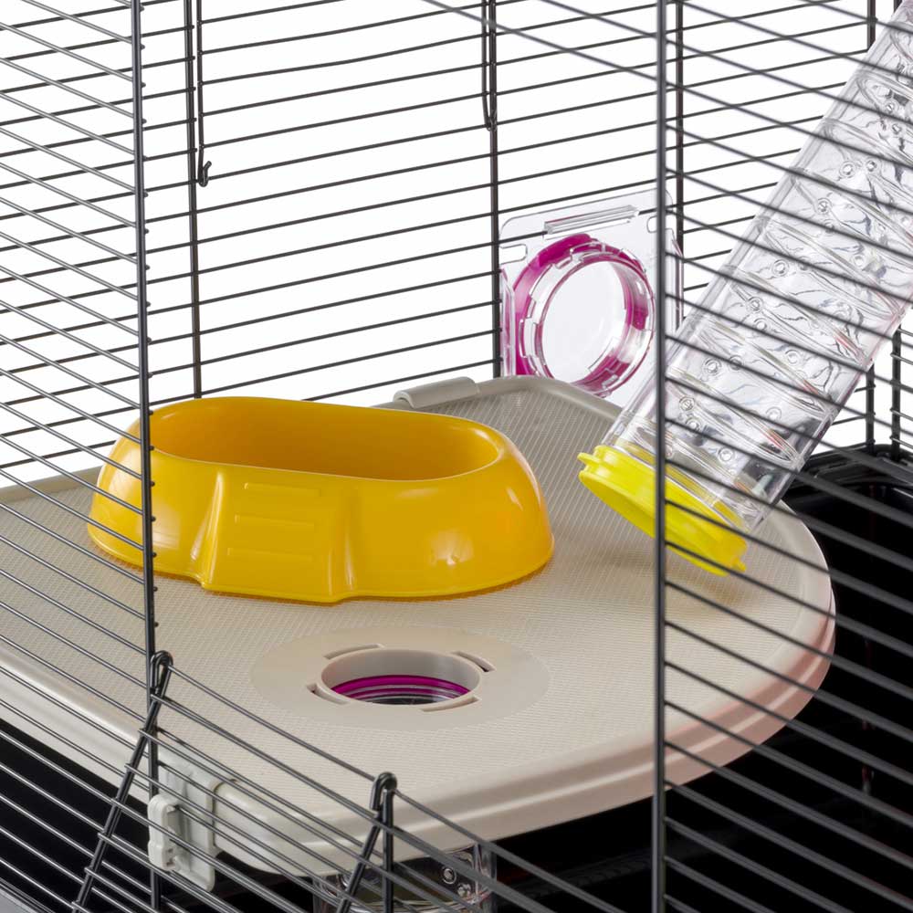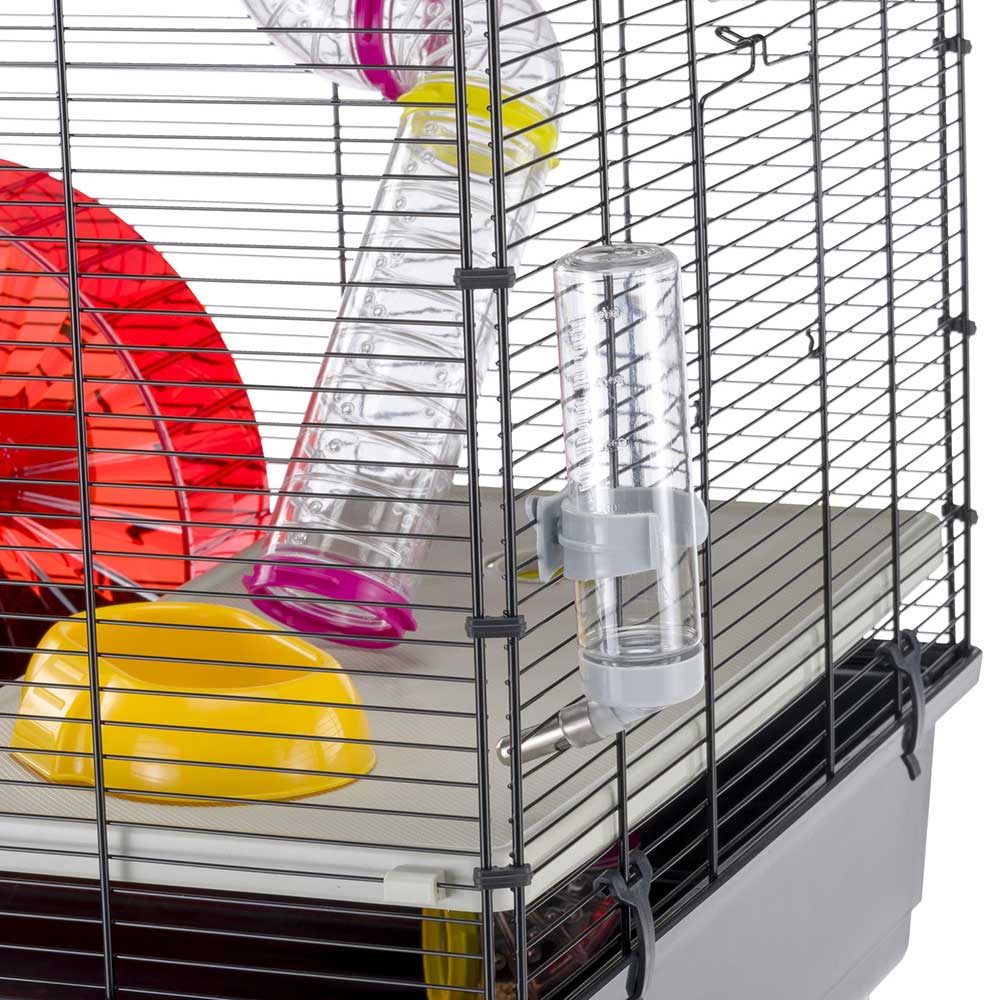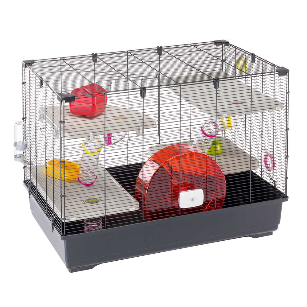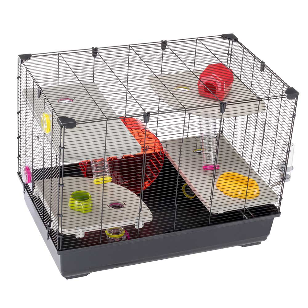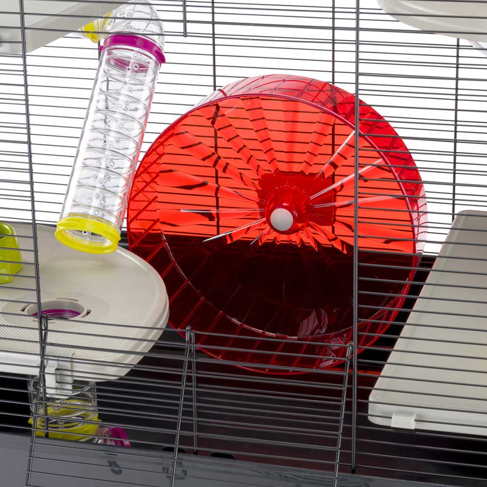 Village 80 by Ferplast is a spacious hamster cage designed to encourage movement and play. It is in fact divided into different levels which create areas designed for different times of the day, thanks to some shelves connected by transparent plastic tunnels. The habitat is complete with accessories for hamsters: feeder, bowl, water bottle, house and hamster wheel.