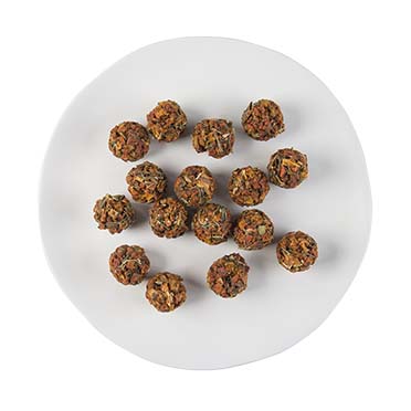 flavours CompositionDerivatives of vegetable origin (4% timothy hay), vegetables (9.5% peas, 2% dill, 2% beetroot), grains, fruits (2% papaya), oils and fats, mineralprotein 13,3 %Crude fat 2 %Crude fibre 17,4 %Crude ash 5,6